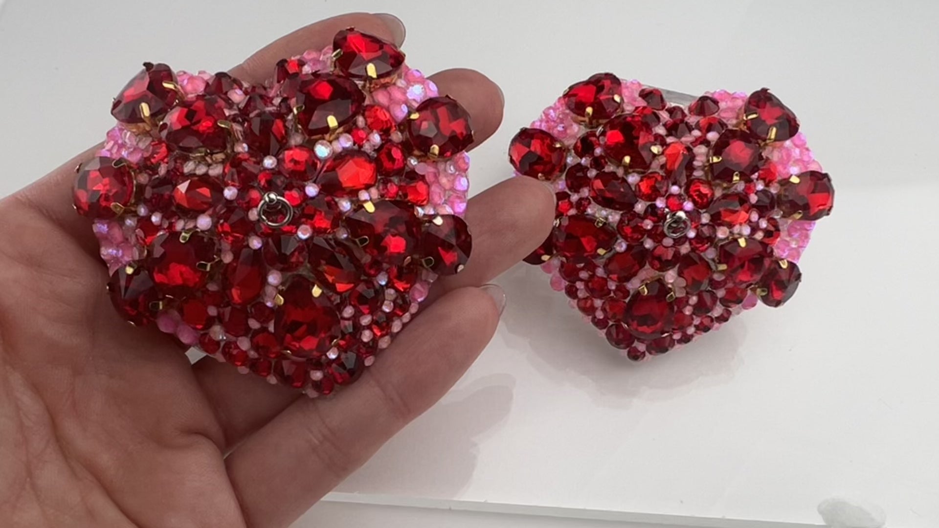 Experience ultimate opulence with these red and pink heart-shaped pasties, adorned with sparkling crystals and gems.